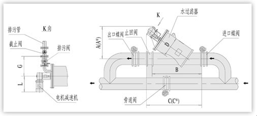 型號 管徑 (mm) 過濾流量 (m3/h) 過濾面積 (cm2) 排污閥DN (mm) 一次清洗水量(L) 電機(jī)功率 (KW) 重量 (Kg) D (mm) A (mm) B (mm) C (mm) C (mm) H (mm) L (mm) G (mm)