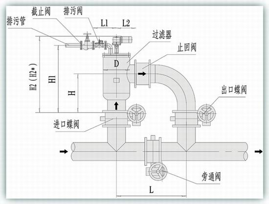 型號 管徑 (mm) 過濾 流量 (m3/h) 過濾 面積 (cm2) 排污 閥DN (mm) 一次清 洗水量 (L) 電機(jī) 功率 (KW) 重量 (Kg) D (mm) H (mm) H1 (mm) H2 (mm) H2 (mm) L1 (mm) L2 (mm) L (mm)